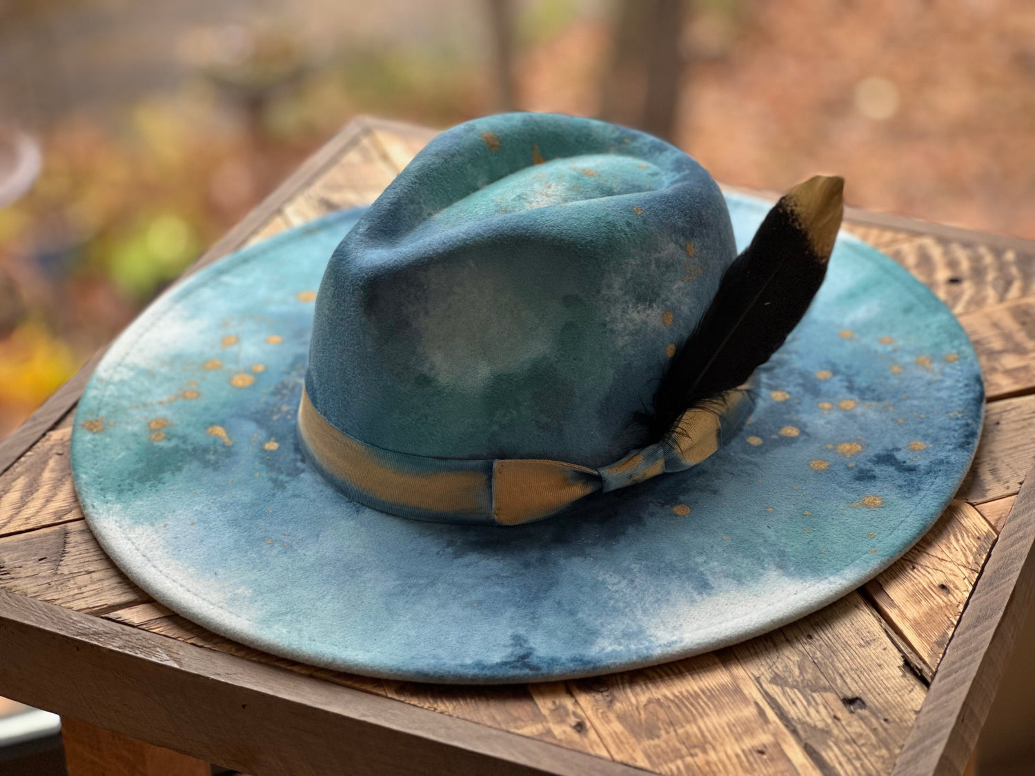 Lenos embellishes felt hats using dyes, paints, fabric, thread, upcycled items and natural elements.